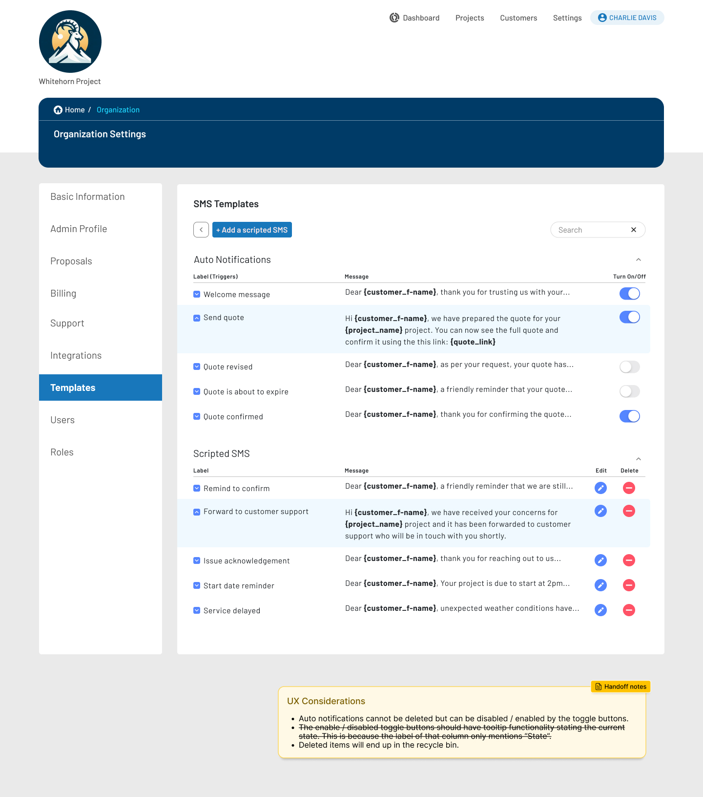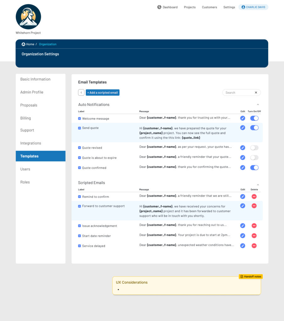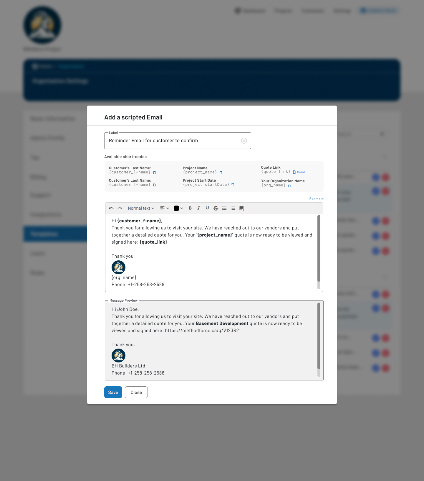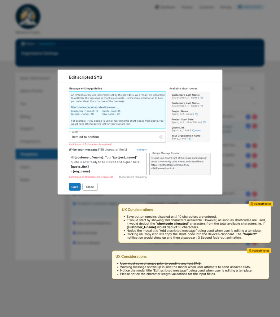 - Enabled dynamic personalization using short-codes (customer name, project, links)